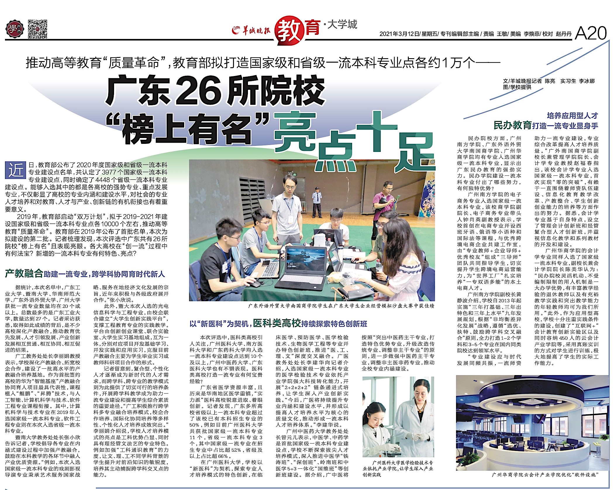 2019年,教育部启动“双万计划”,拟于2019-2021年建设国家级和省级一流本科专业点各10000个左右,推动高等教育“质量革命”。教育部在2019年公布了首批名单,本次为拟建设的第二批。记者梳理发现,本次评选中广东共有26所院校“榜上有名”且表现亮眼。各大高校在“创一流”过程中有何法宝?新增的一流本科专业有何特色、亮点?
