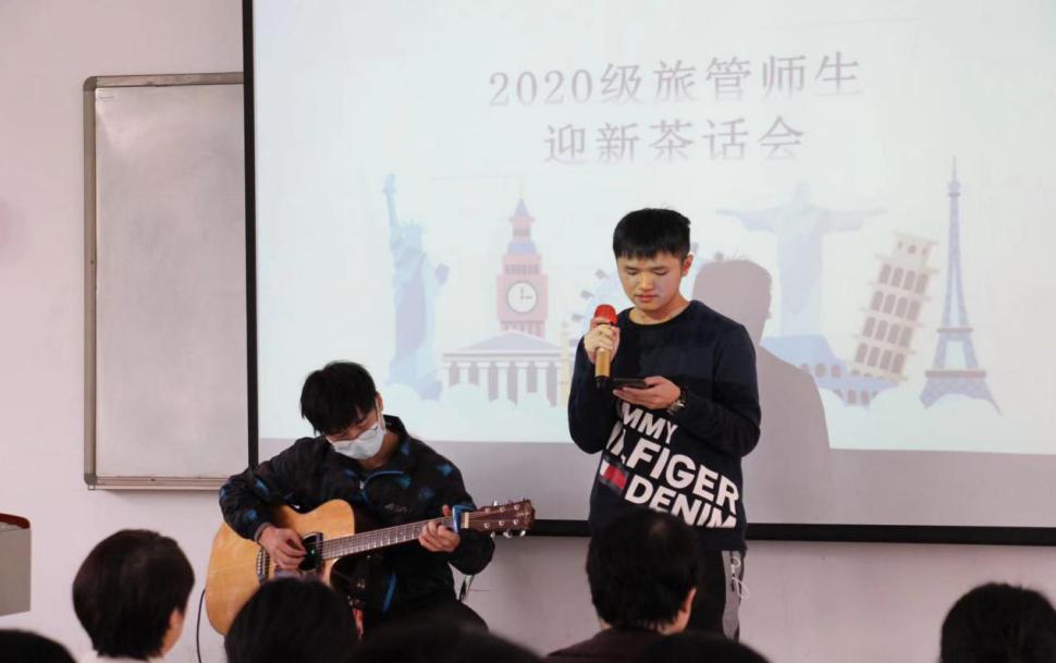 旅游管理的同学也多才多艺。罗修洪同学、陈家轩同学、肖艺涵同学为大家带来了吉他弹唱和歌曲表演。