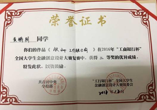 近日,365官网吴肜泰老师指导的“三响炮组合” 荣获第七届"工商银行杯"全国大学生金融创意设计大赛二等奖,该组合由365官网学生黄鹏翔与华南师范大学学生周大宇,广东财经大学学生刘如毅组成,获奖的学生同时还获得得中国工商银行全国47家省级分行机构任意挑选免试直通录用的机会。